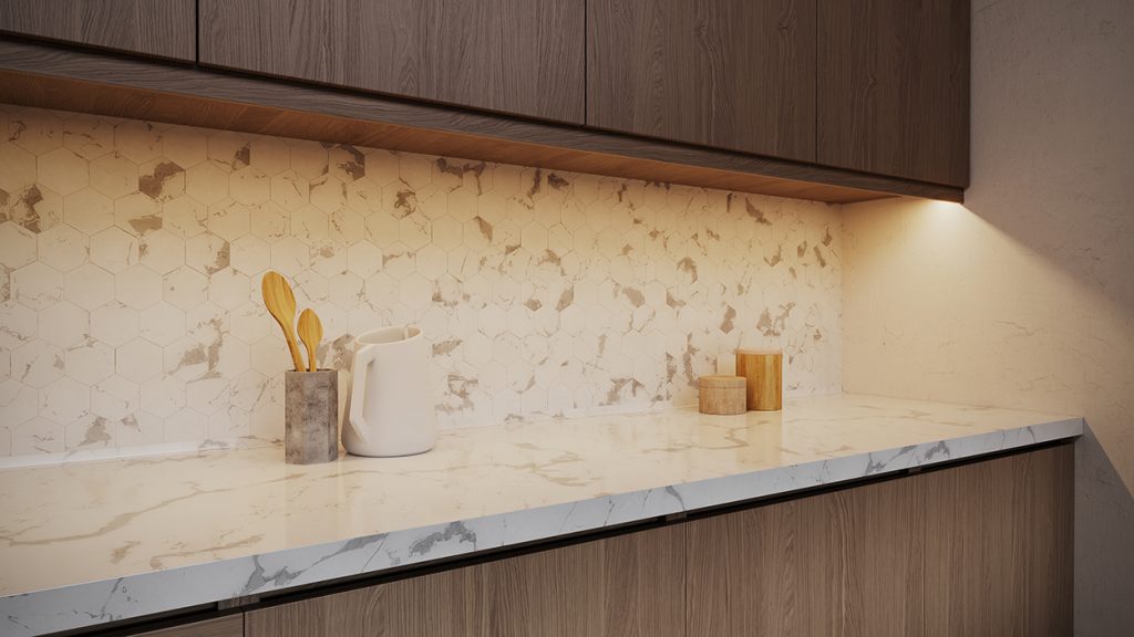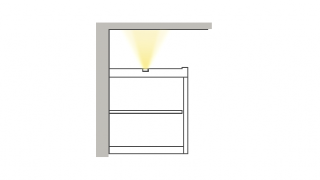 Positioning the light towards the center of the cabinet delivers light to the work surface and to the backsplash. It’s a balanced option that is ideal for average depth countertops. The channel can be embedded into cabinet millwork or surface mounted.