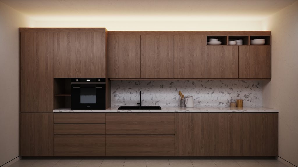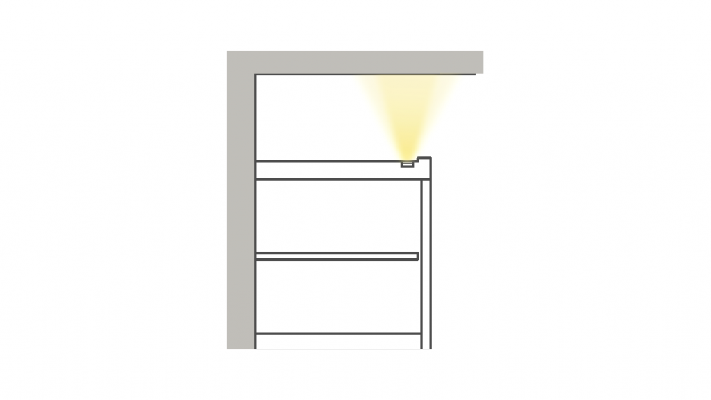 Balance useful ambient light in the room with a decorative effect on the wall behind the cabinets.