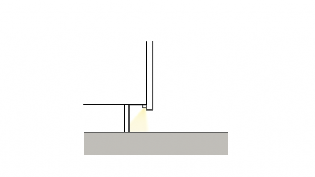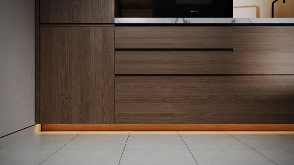 Emphasize light projection from the toe-kick onto the floor beyond the cabinet.