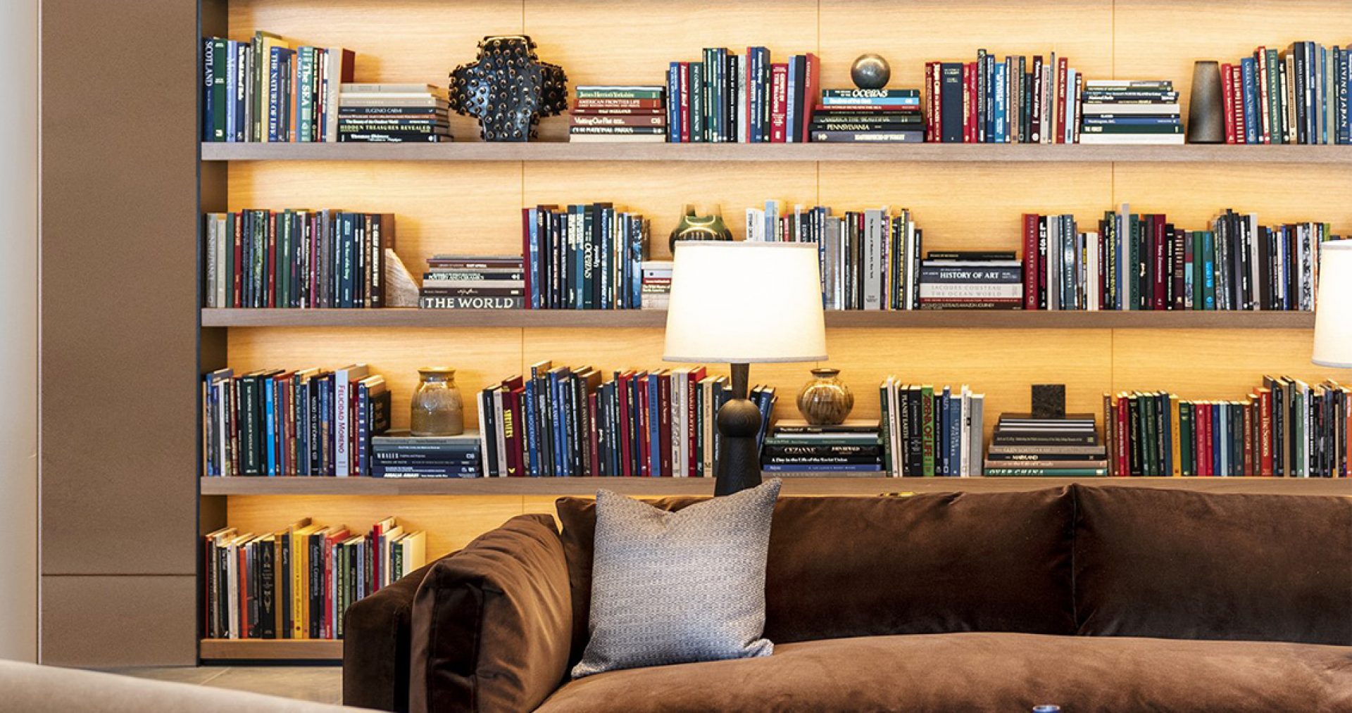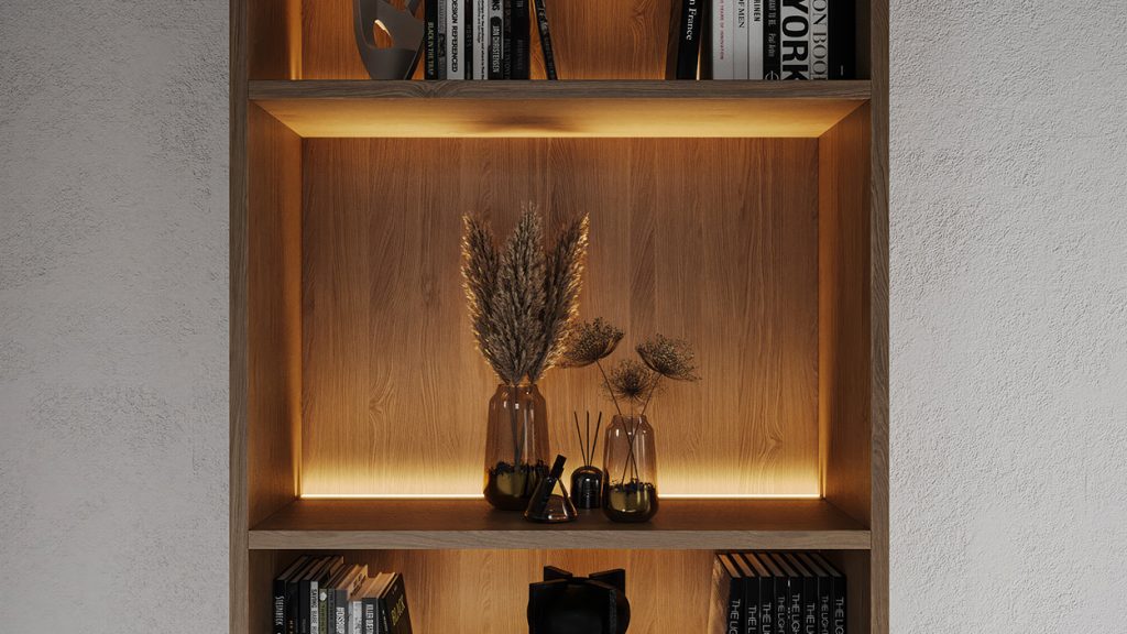 Mount the light at the front of the upper shelf, aiming down. Either recess the light into the shelf, and/or build a small valence to conceal the light further and prevent glare. Leave grooves or slots for wire management for the wires leading into and/or out of the fixtures.