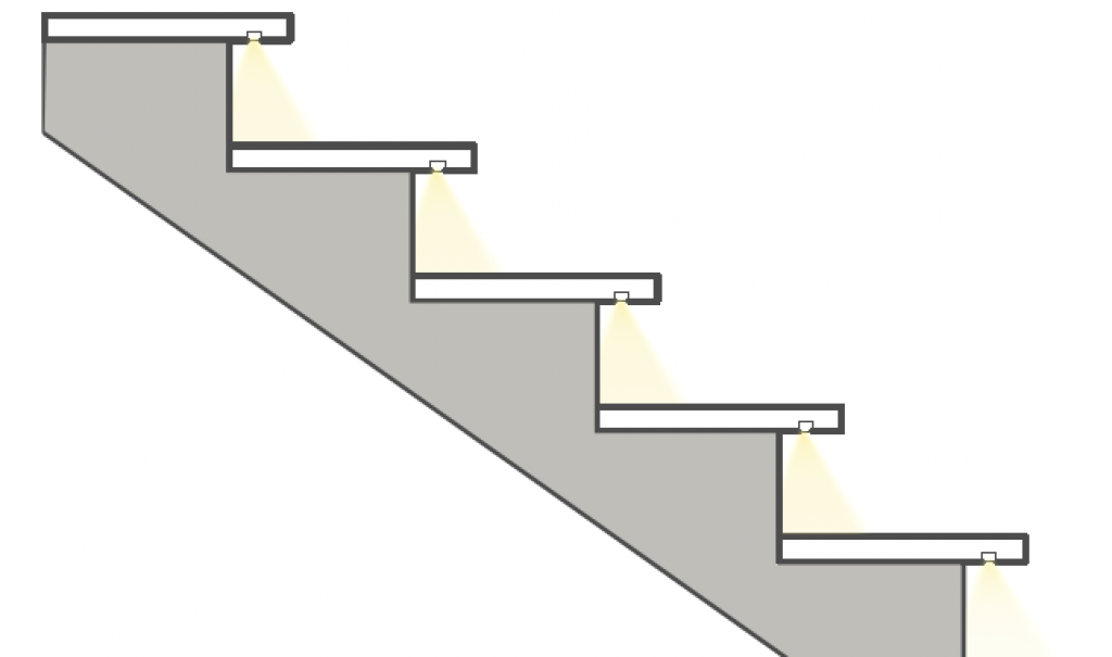Position the linear light under each step, aiming downward. Use an accent-level light and install a wire chase down one side so each length's lead can be run back to the LED drivers at a central, accessible location.